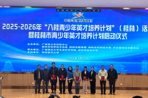 2026年3月22日,2025—2026年“八桂青少年英才培养计划”(桂林)活动暨桂林市青少年英才培养计划启动仪式在桂林中学(临桂校区)顺利举行,市科协主席梁劲等出席活动,来自桂林中学、桂林市第十八中学等学校的24名中学生,将获高校名师指导开展科研实践。