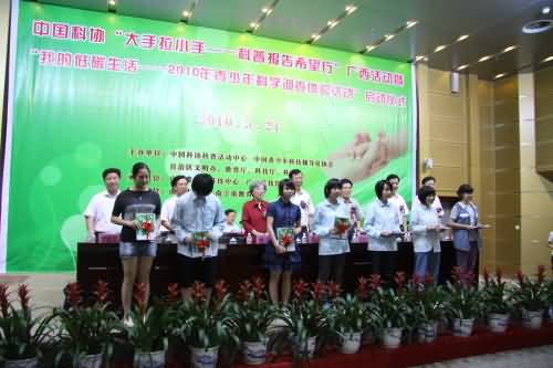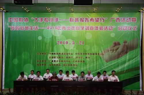 当天在广西科技馆举行了名为中国科协“大手拉小手——科普报告希望行”广西活动暨“我的低碳生活——2010年青少年科学调查体验活动”启动仪式。启动仪式前自治区政协副主席李彬,在自治区文明办、教育厅、科技厅、科协等单位领导的陪同下,接见了中科院老科学家科普演讲团的专家们和广西未成年人科普演讲团团长蒋应时教授和专家代表。李副主席向中科院的老专家们表达了亲切的问候和致意,并向专家们介绍了广西的一些经济、社会、人文和自然状况,以及近年来广西发展规划和对科技投入情况。中科院老科学家科普演讲团名誉团长钟琪教授向李副主席介绍了此次来桂的专家教授,并对广西近几年的高速发展表示欣喜,同时对广西科协开展青少年科普工作所取得的成绩表示赞同。