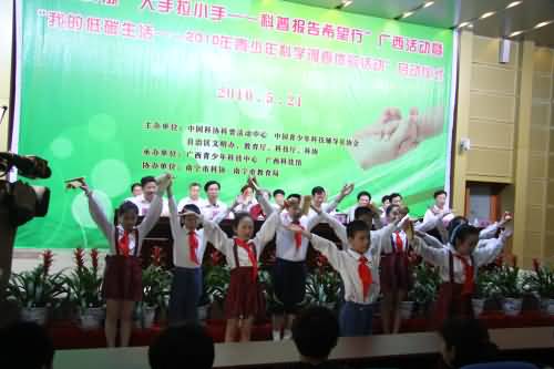在仪式上,与会领导还向学生代表赠送“我的低碳生活——2010年青少年科学调查体验活动”的《活动手册》。期间,来自南宁市星湖小学的学生代表们还献上了《我的低碳宣言》,学生们用快板道出“低碳生活”心声,精彩的表演使启动仪式现场气氛活跃,高潮迭起。最后,自治区政协副主席李彬宣布活动正式启动。