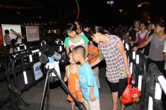 10月3日中秋节当晚,广西科技馆在科技馆广场组织“探索月球的秘密”——中秋赏月天文活动。工作人员在广场上,架设三架望远镜,配上大屏幕投影供市民进行赏月。市民不仅可通过天文望远镜观看月亮,还可通过望远镜现场同步投影“近距离”观赏月亮上面的环形山、月海和辐射纹等精细结构。近千名市民参加了活动。