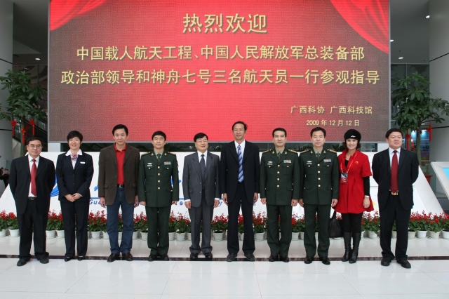 12月12日上午,中国“神七”航天英雄翟志刚、刘伯明、景海鹏、中国载人航天工程办公室副总设计师赵宇棋等一行,在自治区副主席陈章良等陪同下莅临广西科技馆参观考察。广西科协党组书记、副主席甘向群,广西科协党组成员、副主席谢林城、广西科技馆馆长梁春花等到馆迎接。