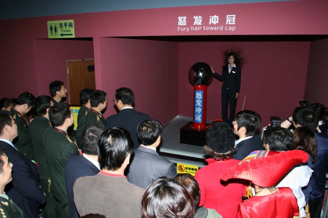 航天英雄翟志刚等观看科技馆展品“怒发冲冠”演示