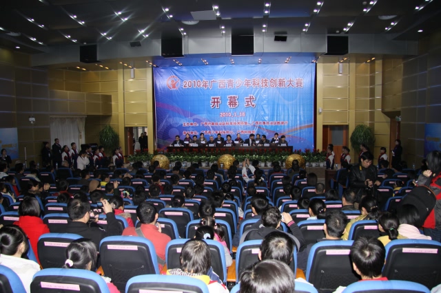 广西青少年科技创新大赛是面向广西区在校中小学生开展规模最大、层次最高的具有示范性和导向性的青少年科技竞赛活动。本次大赛由广西科协、广西教育厅举办、广西青少年科技中心、广西科技馆承办。自治区副主席李康、自治区政协副主席黄日波、自治区科协主席、中国工程院院士郑皆连、自治区科协党组书记、副主席甘向群以及自治区文明办、教育厅、科技厅、共青团区委、区妇联等相关领导出席了开幕式。开幕式上,自治区教育厅副厅长杨伟嘉、自治区科协党组书记、副主席甘向群为大赛做了致辞。随后,自治区政协副主席黄日波进行了重要讲话。开幕式过程中,星湖小学的15名少先队员还为本次创新大赛献词。最后,自治区副主席李康隆重宣布2010年广西青少年科技创新大赛正式开幕!全场选手高呼,放飞青春,放飞希望,放飞梦想,把现场气氛推向了高潮。