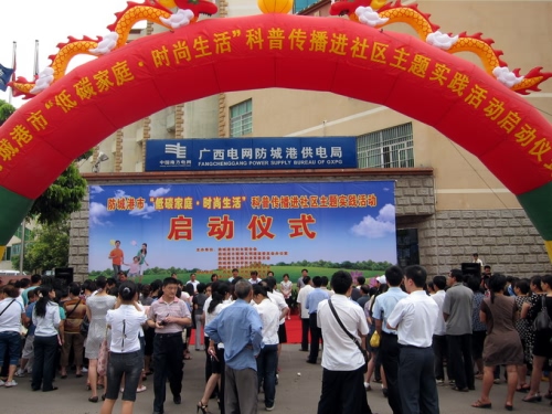 5月26日上午,由防城港市妇联、市文明办、市发改委、市科协和市社科联联合主办,防城港供电局、港口区白沙万街道办事处协办的,防城港市“低碳家庭·时尚生活”科普传播进社区主题实践活动在防城港供电局门前举行了启动仪式。这是我市贯彻落实自治区妇联、自治区文明办、自治区发改委、自治区科协《关于深化节能减排社区行动开展“低碳家庭·时尚生活”主题活动的通知》的具体行动。